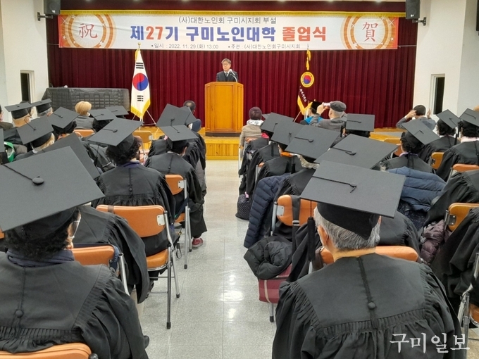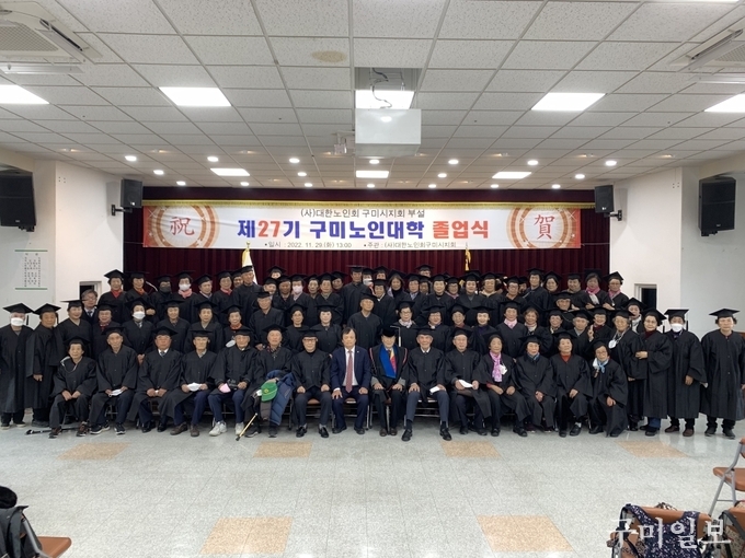 구미시(시장 김장호)는 지난 11월 29일(화) 오후 1시 노인종합복지관 3층 대강당에서 (사)대한노인회구미시지회(회장 최경호) 주관으로 노인대학 졸업생, 기관단체장 등 160여명이 참석한 가운데 제27기 구미 노인대학 졸업식을 가졌다.
