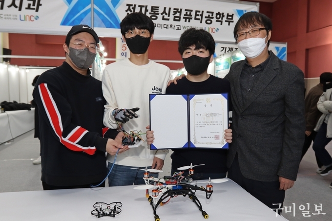 캡스톤디자인에서는 복잡한 조종기 대신 제스처(손장갑 센서)를 통해 드론을 제어하는 작품으로, 전자통신컴퓨터공학부 AI전자공학전공 ‘AI 드론 첼린저’ 팀(권희찬 외 2명, 지도교수 조재한)의 ‘제스처를 인식하는 AI 드론제어’ 작품이 영예의 대상을 안았다.