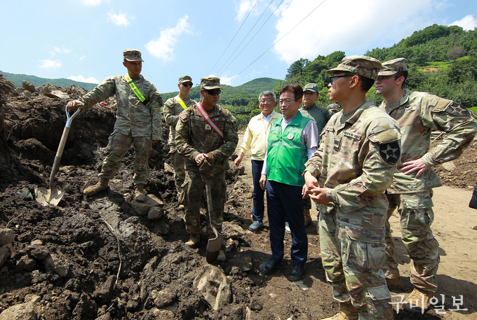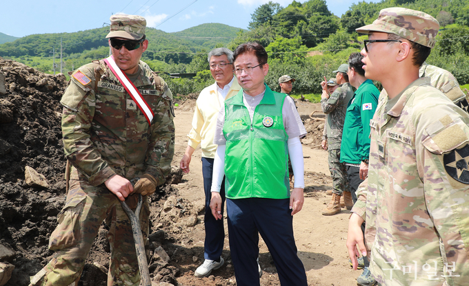 이철우 도지사는 드론으로 촬영된 피해 현장 영상을 확인하고, 무더운 날씨에도 현장에서 땀 흘리며 복구 지원에 나서고 있는 미 11공병대대 장병들과 악수하며 “굳건한 한·미동맹의 상징이자 호우 피해 복구에 큰 힘을 보태주고 있는 여러분께 감사하다”라고 말했다.