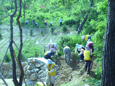 왕산기념관 주변 숲은 임은동 산 7번지 일대(부지 9,717㎡)로 지난 3. 31 식목일 행사에 고급 수종과 철쭉류 등 10,000여본이 식재되어 있는 시유지로서, 식목행사 이후 아카시아 등 잡목과 잡풀이 무성하여 식재된 묘목을 살리기 위해 실시하였다. 이길수 임오동장은 현장을 방문하여 작업전 안전교육을 실시하여 안전사고 예방에 철저를 기하여 줄 것과 특별히 무더운 여름철에 숲가꾸기 사업에 수고가 많은 근로자들에게 식염포도당을 제공하는 등 근로자의 건강과 안전에 최우선을 두며 사업참여를 거듭 당부하였고, 숲 가꾸기 사업에 적극 참여 성공적으로 마쳐 준 근로자들에게 시원한 아이스크림(60개, 60,000원 상당)을 제공하며 격려하였다. 임오동에서는 숲 가꾸기사업을 지속적으로 추진, 향후 왕산기념관 개관시 관람객에게 아름답게 잘 조성된 숲과 잘 어우러지는 왕산기념관 이미지를 심어주기 위해 더욱 더 노력할 것이다. |