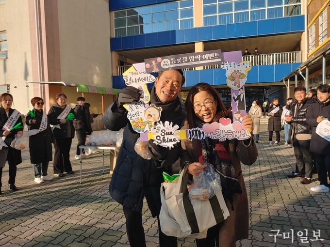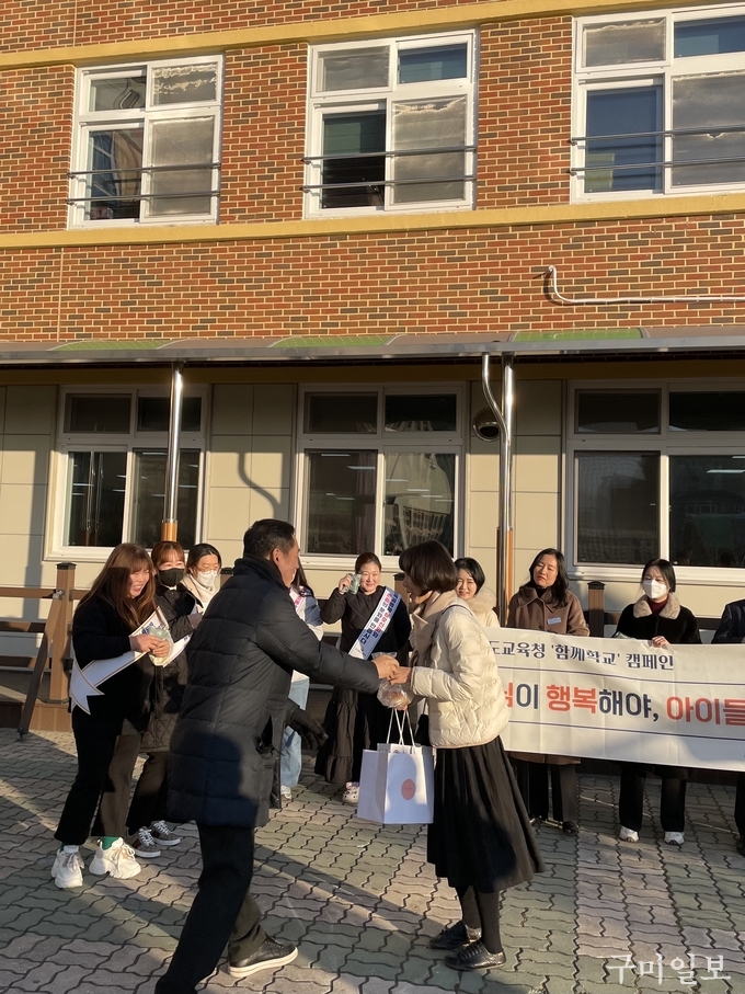 구미교육지원청(교육장 이성희)은 11얼 22일(수) 봉곡중학교에서 교원을 대상으로 한 ‘등굣길 교원 깜작 응원이벤트, 선생님이 행복해야 아이들이 행복합니다’를 실시하였다.