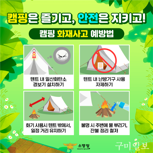 임준형 구미소방서장은 "캠핑장 안전사고는 인명피해로 이어질 위험이 크다"며 "야영장 관계자·이용객께서는 화재예방 안전수칙 준수에 적극적으로 동참해 달라"고 전했다.