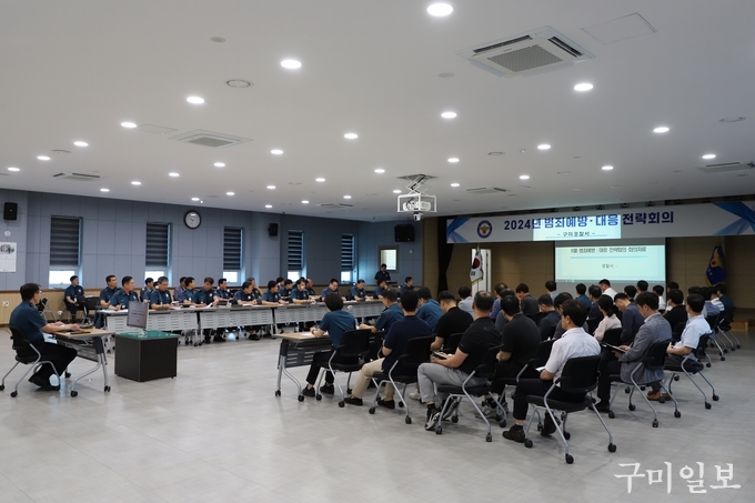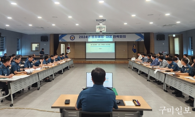 구미경찰서(서장 박종섭)는 6월 10일(월) 구미경찰서 3층 대회의실에서 각 과·계(팀)장과 관내 모든 지역경찰관서장 등 58여명이 참석한 가운데 5월에 이어 절도범죄 감소를 위한 6월 범죄예방·대응 전략회의를 개최했다.