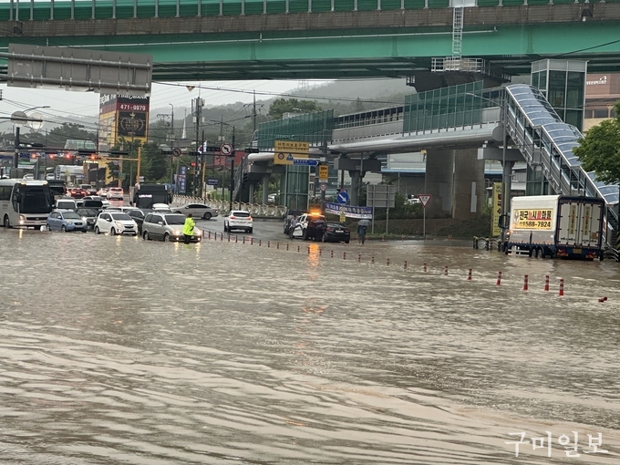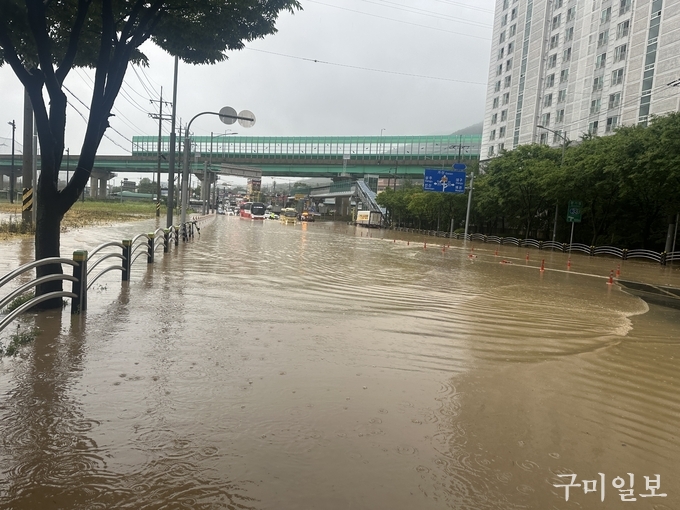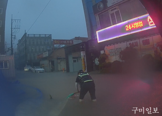 이러한 가운데 같은 날 새벽 5시 28분경부터 구미경찰서 112치안종합상황팀에 “큰 도로와 거리 등이 침수되어 차량 통행이 위험하다”는 등 20건 가량의 신고가 접수됐다.