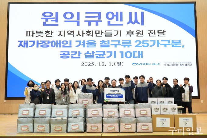 원익큐엔씨(대표 백홍주)는 12월 1일 구미시장애인종합복지관(관장 김휴진)에 후원금 1,750,000원과 7,000,000원 상당의 적외선 살균기 10대(1대당 70만 원)를 전달했다. 전달된 후원금은 재가장애인 25가정에 겨울 이불을 지원하는 데 사용될 예정이다.