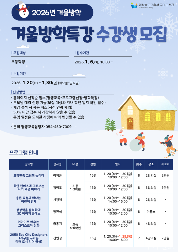 경상북도교육청 구미도서관(관장 최선지)은 다가오는 겨울방학을 맞아 오는 1월 6일(화)부터 겨울방학특강 수강생 모집을 한다고 밝혔다.