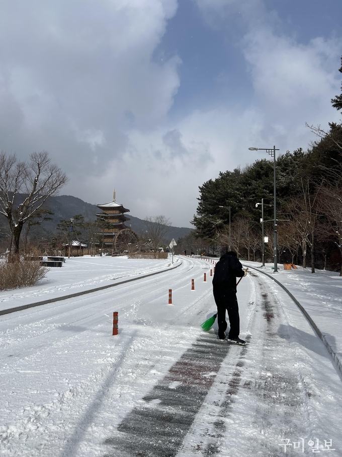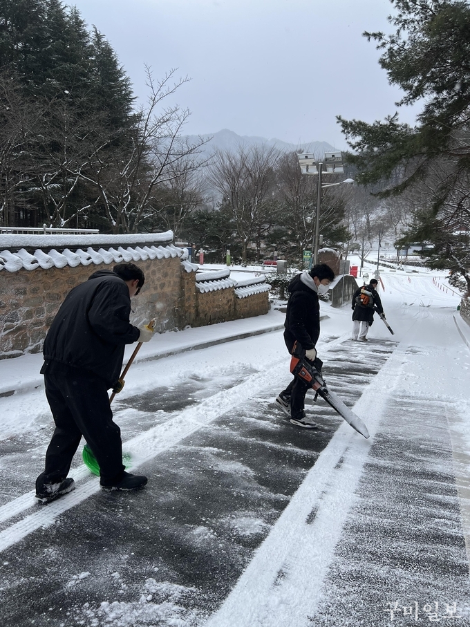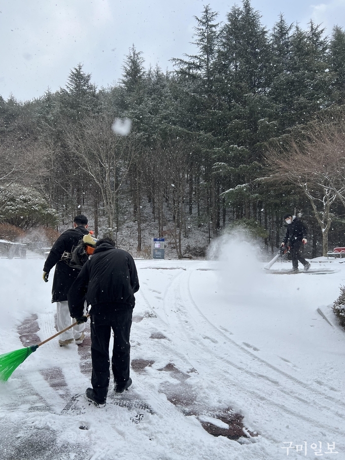 김천시시설관리공단(이사장 김재광)이 운영하는 사명대사공원에서는 금일 새벽부터 내린 폭설로 공원 내 보행로와 주요 동선에 적설이 발생함에 따라, 공단 직원들이 송풍기와 빗자루 등 장비를 들고 제설작업에 나섰다.