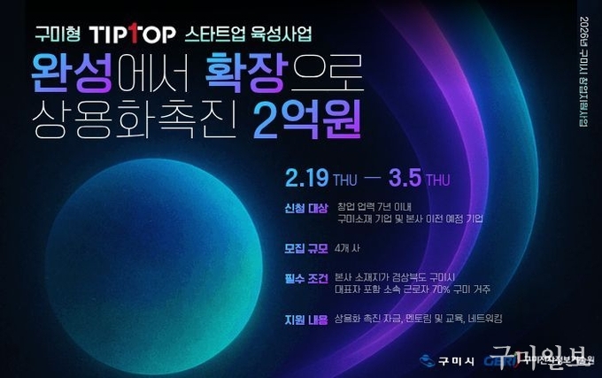 구미시가 기술 기반 유망 창업기업의 성장을 지원하기 위해 ‘2026년 구미시 New Venture 창업지원사업’과 ‘2026년 구미형 TipTop 스타트업 육성사업’ 참여기업을 모집한다. 초기 창업기업 발굴부터 기술 상용화까지 성장 단계에 맞춘 지원으로 지역 내 혁신 스타트업을 체계적으로 육성한다는 취지다.