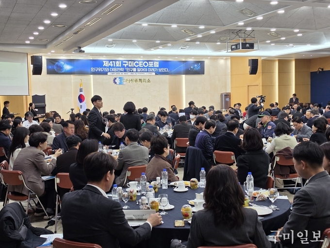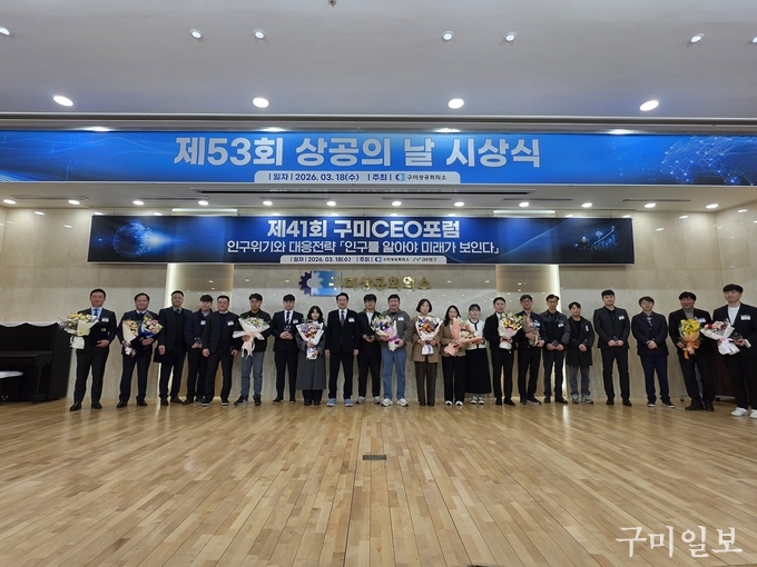 구미상공회의소(회장 윤재호)와 iM뱅크(은행장 강정훈)는 3월 18일(수) 7시 30분, 구미상공회의소 2층 대강당에서 윤재호 회장, 강정훈 은행장, 김장호 구미시장, 박교상 구미시의회 의장, 김상호 국립금오공과대학교 총장을 비롯한 기관단체장, 시의원, 상공의원, 회원사 대표 및 임직원, 언론사 등 250여명이 참석한 가운데「제41회 구미CEO포럼 및 제53회 상공의 날 시상식」을 개최하였다.