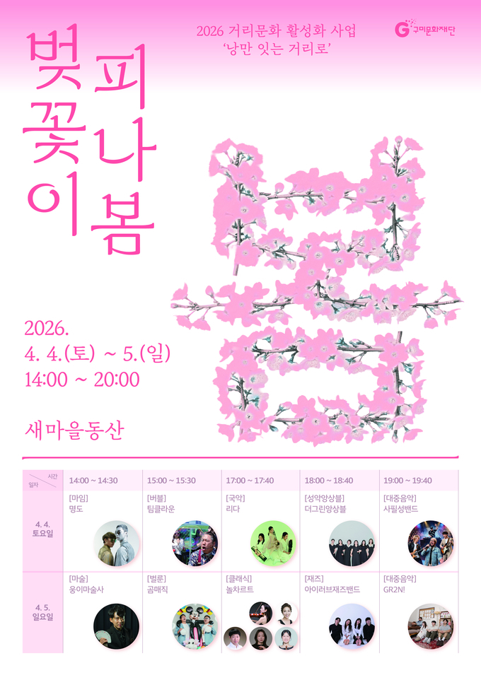 이한석 구미문화재단 대표이사는 “벚꽃이 피는 봄날에 맞춰 시민들이 문화와 함께하는 시간을 마련하고자 했다”며 “앞으로도 일상 가까운 곳에서 문화를 향유하며 함께 성장하는 문화도시 구미를 만들어가겠다”고 전했다.