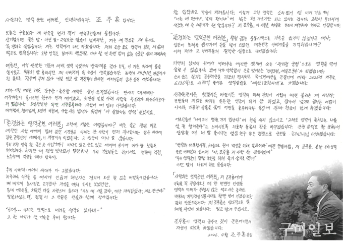 새벽 바닷길을 걸으며 떠올린 어머니들의 삶, 장날이면 북적이던 시장의 풍경, 사람 사는 냄새로 가득했던 영덕이 ‘어느새 텅 비어가는 것 같다’는 절박함을 담담히 적었다. 그러면서 “관리형 군정으로는 영덕을 먹여 살릴 수 없다”, “경영 군정과 세일즈 군정으로 살림을 벌어오겠다”는 의지를 자필로 풀어낸 데 이어 “믿고 맡겨 달라”는 당부로 끝을 맺었다.