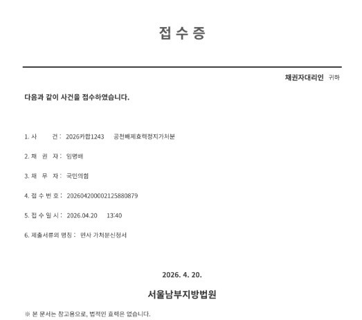 임명배 예비후보는 4월 20일 오후, 서울남부지방법원에 국민의힘을 상대로 ‘공천배제 효력정지 가처분 신청서(사건번호: 2026카합1243)’를 제출했다고 밝혔다.
