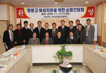 간담회에 함께 참석한 박수봉 경상북도교육위원은 지방자치단체장이 직접 학교현장을 방문하여 교사들에게 격려와 학교발전을 위한 지원에 관심을 보여준대 대해 감사하다는 말을 전했다. 이번 순회간담회 일정은 ‘과학중점학교’로 지정된 구미고(교장 황무길)에서는 과학교육을 받은 인력양성을 목적으로 인문소양과 심도 있는 과학지식을 겸비한 청소년 양성을 위해 일반계 고등학교에 개설한 과학전문교육과정의 발전과 지원에 대하여는 24일에 개최되며, 도농복합도시 등 교육여건 개선과 교육력 제고를 위한 ‘기숙형 고교’로 선정된 선산고(교장 임원기)와 구미여고(교장 박용기)는 26일 개최 한다. 구미시에서는 ‘이번 지역 명문고 육성을 위한 순회간담회를 통해 지역의 교육경쟁력 강화를 위해 애쓰고 있는 학교에는 지자체와 교육청 등의 상당한 혜택을 받은 것으로 예상된다며 명문고로 발돋움할 수 있는 계기를 마련하였다’고 말했다. |
