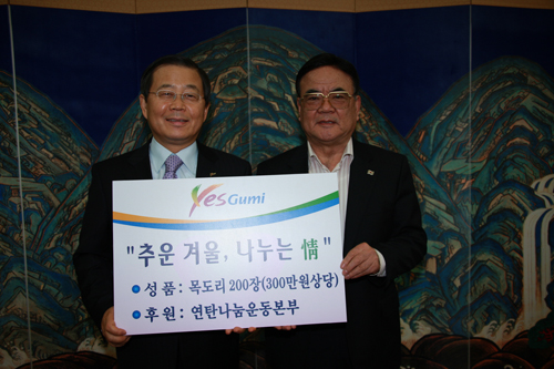 | | | ▲ 연탄나눔운동본부 황영본부대표 목도리전달 | | 연탄나눔운동본부는 2008년 발족하여 장애인과 비장애인이 상생하는 사회를 구현하기 위하여 올해에도 연탄나눔 운동을 펼치게 되었으며, 상모교회 및 LG경북협의회 등 여러 단체의 후원을 받아 구미시 저소득세대에 연탄 13,500장(675만원상당), 김치(5kg)400박스(500만원상당)를 전달 하였다.