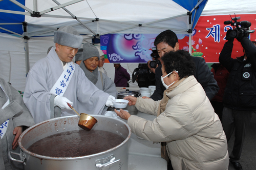 김천지역 조계종 사암연합회 소속 28개 사찰들은 15일 오전 11시부터 오후 2시까지 김천역 광장에서 행인들에 팥죽을 나누는 "동지맞이 자비나눔 팥죽공양" 행사를 진행한다. 직지사 주지 성웅 스님은 "김천역 광장 뿐만 아니라 김천시내 시장을 돌며 스님들이 상인들에 팥죽을 나눌 계획"이라며 "어려운 현실을 다함께 극복해 나가자는 각오를 다지기 위해 김천시민들을 위해 마련했다"고 밝혔다. 팥죽나눔 행사에는 직지사 강원 학인과 김천지역 사찰 스님, 신도 80여명이 참여할 예정이다. |