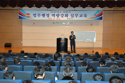 최근 증가추세에 있는 민사 및 행정소송을 원활하게 추진하여 승소율을 제고하고, 시민들에게 보다 질 높은 행정서비스를 제공하고자 행정소송 실무 및 행정법 강의를 5시간에 걸쳐 실시하였다. 이날 강의는 법무부 김현호 부장검사와 법제처 창의정책담당관(부이사관)을 강사로 초빙하여 김천시 공무원의 법무행정에 대한 역량을 강화하고 현장에서 체험한 많은 소송사례와 행정실무를 바탕으로 현장감 있는 교육을 통하여 김천시 공무원의 업무수행에 많은 도움이 되었다. 김천시 관계자는 하루가 다르게 급변하는 지방자치의 행정환경에 적극적으로 대처하고 각종 행정행위의 적법하고 공정한 처리와 질 높은 행정서비스 제공을 위하여 법무업무 연찬 교육을 지속적으로 실시할 계획이라고 하였다. |
