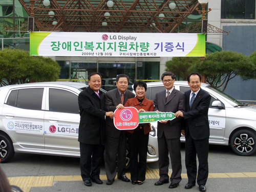12월 30일, LG디스플레이 장효철 구미경영지원담당, 석호진 노동조합지부장이 장애인복지관을 방문, 조상배 장애인복지관장에게 경승용차 2대를 전달하였으며 시에서도 최경환 주민생활지원국장이 참석하여 축하해 주었다. 이번 기증행사는 “장애인복지관이 차량부족 인하여 읍면지역 장애인에게 찾아가는 재가복지사업을 실시하지 못하고 있다”는 안타까운 사연을 접하면서, 소외지역 장애인들이 보다 편안한 삶을 살아갈 수 있도록 전 사원들의 정성을 모아 차량 2대를 마련, 기증하게 되었다. 차량을 기증받은 조상배 장애인복지관장은 “장애인복지 소외지역으로 남아 있던 읍면지역을, LG디스플레이의 차량후원으로 읍면 골목길을 누비며 장애인 가정을 방문할 것을 생각하니 벌써부터 마음이 설렌다”면서, “전 사원의 바람대로 장애인이 행복한 세상을 만드는데 더욱 노력하겠다”고 고마움을 전했다. 전달식에 참석한 LG디스플레이 장효철 구미경영지원담당은 “올해는 세계적 경제 불황으로 우리 모두가 어려움을 겪었으나, 구미시민들의 LG디스플레이에 대한 무한사랑으로 잘 극복한 것 같다”면서, “내년에도 LG디스플레이와 구미가 함께 더욱 도약하는 한 해가 되었으면 한다”는 염원을 밝혔다. 한편, LG디스플레이는 2009년 한 해동안 전 사원들이 사회공헌 활동에 참여하여, 이웃돕기 성금 기탁, 사랑의쉼터 리모델링 지원, 어린이재단 결식아동돕기 유아마라톤 대회 지원, 자매 결연시설 11개소와 다문화가정에 김치 2000포기와 쌀 268포대 지원 등 지역의 어려운 곳을 찾아 후원과 봉사활동을 전개하여, 보이지 않는 곳까지 사랑을 실천하였다. |