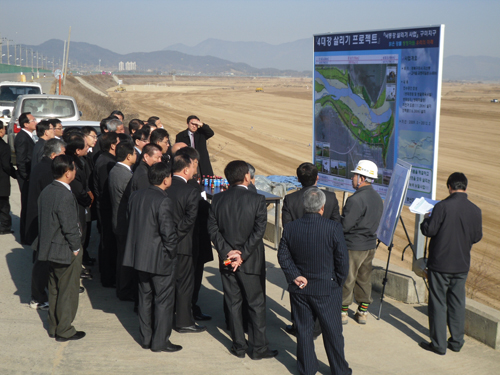금회 현장 견학에서는 낙동강 살리기 사업과 연계된 "구미지구 생태하천 조성사업"과 "낙동강 둔치 다목적 광장 조성공사"에 대하여 실시하였으며, 내년에 실시되는 현장견학에서는 낙동강살리기사업의 주요사업인 30공구(구미보) 가설현장을 포함하여 실시한다. 이번 현장견학에서는 먼저 정부의 4대강 살리기 사업의 선도지구인 "구미지구 생태하천 조성사업"의 사업현황과 추진상황에 대해서 설명이 이루어졌다. 구미지구 생태하천 조성사업은 총 350억원(전액 국비)의 사업비로 올해 3월에 착공, 2012년 3월 준공을 목표로 공사가 진행중이며, 금년도 1차 사업(30억원)으로 부지정지작업 등 15%의 공정으로 마무리하였다. 2010년도 2차분은 64억원의 국비를 투자하여 제방성토, 체육시설 설치 등을 추진 할 예정이며, 상류와 하류부분의 생태복원 및 보전시설과 중류부분의 다목적 체육시설(13종: 축구10면, 야구2면, 배구 및 배드민턴, 인라인, 종합경지장, 테니스장 등)로 구분되어 추진되고 있다. 다음으로 3공단 입주업체의 기업하기 좋은 도시여건 조성을 위해 추진되는 낙동강 둔치 다목적 광장 조성공사에 대해서 설명이 이루어졌다. 낙동강 둔치 다목적 광장 조성공사는 15억원의 사업비로 2009년 4월에 착공하여 2010년 2월에 준공을 목표로 하고 있다. 본 사업지구는 다목적 생태환경시설과 친환경 다목적광장 등 종합적인 마스트플랜을 수립하여 낙동강살리기 25공구(턴키 2차)에 반영 시행토록 부산청에 건의하였다. 낙동강살리기사업의 주요사업인 해평 월곡리와 선산 원리의 구미보 가설은 1,788억원의 사업비로 하도준설과 구미보가 설치되며, 2009년 10월에 착공하여 2011년 12월 준공할 예정이다. 주요사업 내용으로는 다기능 보 L= 640m(고정보 536m, 가동보 104m), 공도교(강합성교) L=649m, 어도 L=253m, 소수력발전소 2기, 통합관리센터 1개소, 어도관찰데크로 구성된다. 이번 간부공무원들의 주요사업현장 견학을 통하여 낙동강 살리기 사업의 성공적인 추진과 시민들의 4대강 살리기 사업에 대한 이해을 증진시킬 것으로 기대된다. |