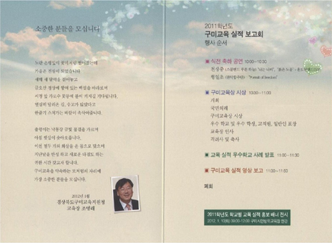 이번 구미교육실적보고회는 예년과 달리 공립유치원, 초, 중학교의 사례를 모두 1편씩 묶어 자료집으로 출간하여 학교 간에 정보를 공유하는 기회를 제공한다. 또한 보고회장 현관에는 관내 모든 초, 중학교의 특색을 홍보하는 배너 전시회를 개최할 예정이다. 본 행사에 앞서 식전공연행사로 천생중학교 스쿨 밴드 ‘푸른 하늘’과 형일초등학교 관악 합주단의 연주회가 열릴 예정이며, 본 행사는 구미교육상 시상식, 우수학교 및 우수 학생, 유공 교직원, 유공 일반인 감사패 수여가 예정되어 있고, 교육실적 우수학교로 선정된 장천초등학교와 상모중학교의 사례발표도 실시할 예정이다. 그리고 2011 구미교육 실적을 총 집결하여 동영상 자료로 보고할 계획이다. 한편, 구미교육지원청은 지역교육청 기관평가 종합 2위, 경북 에듀탑 공모전 최우수상 수상 등 2011학년도에는 예년에 비해 대 내외적으로 훌륭한 실적을 거양한 것으로 평가받고 있다. |