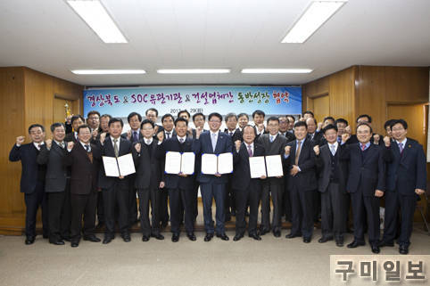 경상북도는 1. 29.(화) 경상북도 종합건설사업소 회의실에서 도내에서 SOC 사업을 시행하는 공기업과 대형건설사, 지역건설업체와 지역건설협회 간에 지역건설산업 활성화를 위한 “동반성장 협약”을 체결하고 상호간 상생발전 방안을 모색하는 간담회를 가졌다.