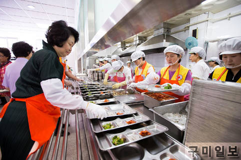 남유진 구미시장 내외분은 2013. 7. 1(월) 11시부터 12시까지 노인종합복지회관 경로식당에서 회관 어르신들을 위한 배식봉사에 참여했다.