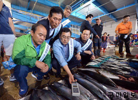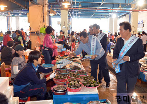 재래시장 상품권으로 재수용품 생선을 구매 하는 등 수산물 안전성 홍보를 위해 어깨띠를 두르고 홍보 팜플렛을 시장을 찾은 소비자들에게 나누어 주었다.