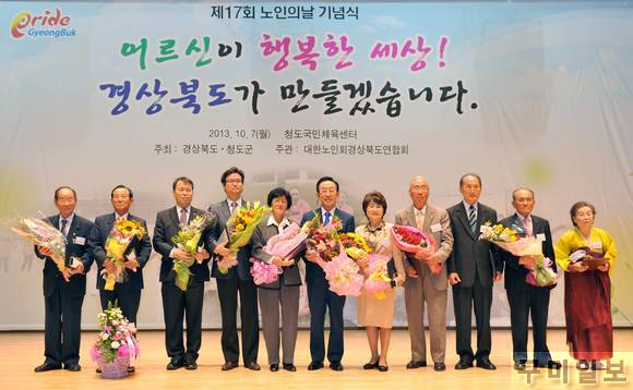 경상북도는 10월 7일(월) 청도 국민체육센터에서 김관용 도지사, 송필각 도의회의장, 이중근 청도군수를 비롯한 지역 기관ㆍ단체장과 어르신 등 1,000여명이 참석한 가운데 『제17회 노인의 날 기념식』행사를 개최했다.