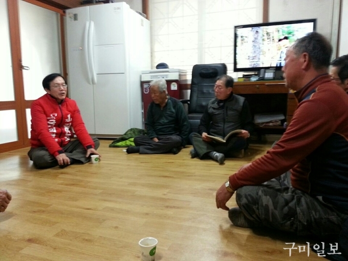 김 예비후보는 사람들이 많이 모이는 행사장을 순회하면서 참석자들에 대한 명함배포 활동과 병행하여 마을회관 및 경로당을 직접 방문하여 지역주민들과 일일이 마주 앉아 최근 구미정치 상황과 관련한 의견을 교환하고 20대 총선의 구미경제 및 생활에의 영향과 중요성을 토론하고 있다.
