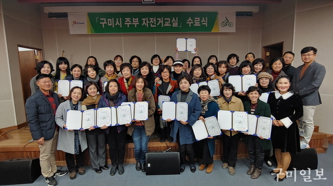 구미시는 11. 29(금) 오전 10시 동락공원 구미과학관 다목적강당에서 전문 강사, 수강생 등 45명 정도가 참석한 가운데 제56기 주부 자전거교실 수료식 끝으로 2019년 구미시 자전거교실을 성황리에 마무리 하였다.