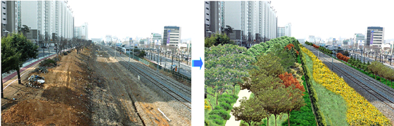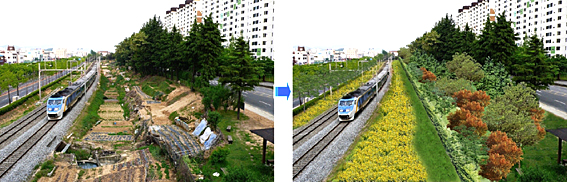 녹지 상단부에는 숲터널을 조성하여 산책로를 만들고, 중간 중간에는 간이운동 시설을 배치하여 시민들의 건강증진을 도모하는 한편 경사진 사면에는 상록수와 청단풍, 이팝, 산딸나무 등 경관목을 함께 식재하여 완충녹지의 기능을 증진한다. 철도녹지와의 경계에는 개나리와 장미를 식재하고, 철도녹지에는 금계국과 코스모스를 심어 쾌적한 도시숲, 살기 좋은 녹색도시 구미를 건설하게 된다. 철도이용객들로부터 구미를 통과할 때에 경작과 방치된 환경으로 인식이 안좋았다는 이야기는 역사속으로 사라지게 되고전국최고의 멋진 철로변 도시숲이 될 것을 확신하고 있다. 이에 따라 구미시에서는 멋진 도시숲으로 거듭나기 위해서는 녹지에 불법경작을 하지 말도록 시민들의 적극적인 협조를 바란다고 말했다. |
