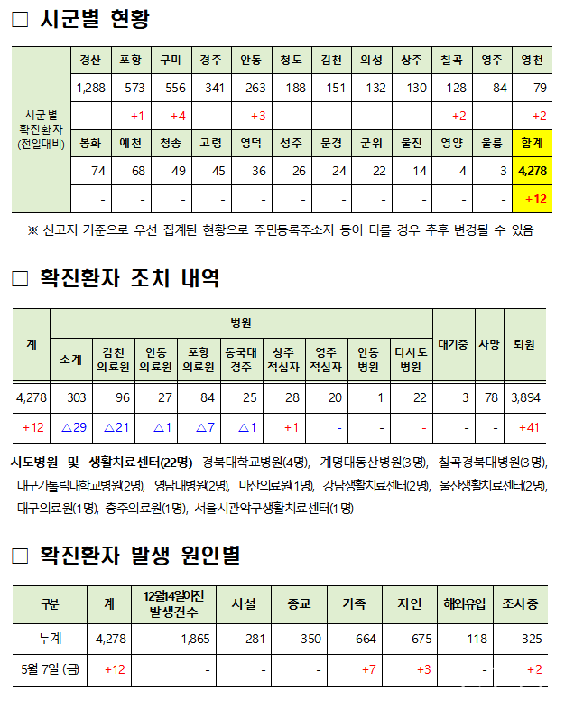경상북도에서는 5월 7일(금) 0시 기준 코로나19 확진자 12명(국내)이 신규 발생하였다.