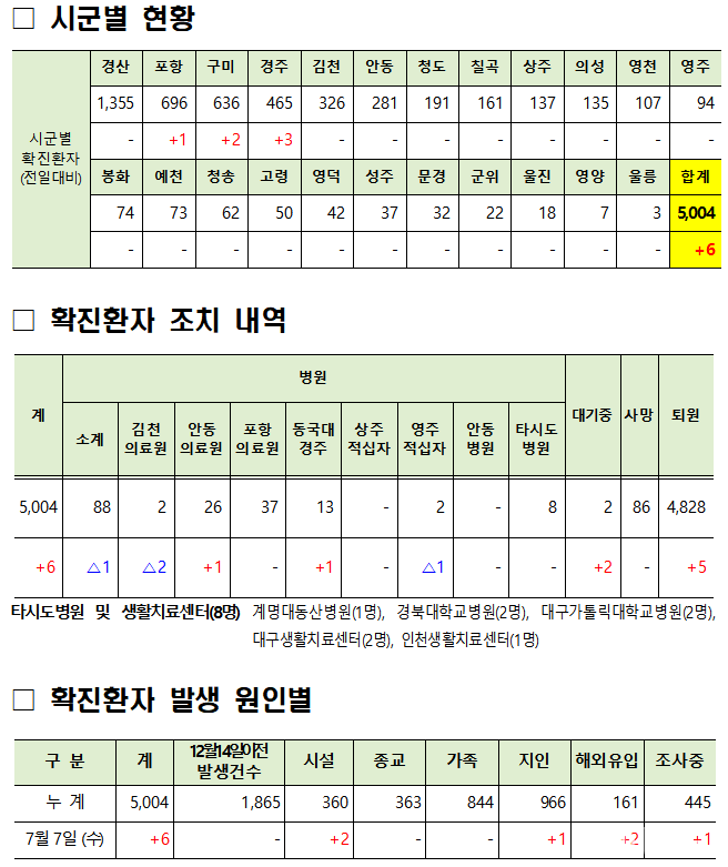 경상북도에서는 7월 7일(수) 0시 기준 코로나19 국내감염 4명, 해외유입 2명이 신규 발생하였다.