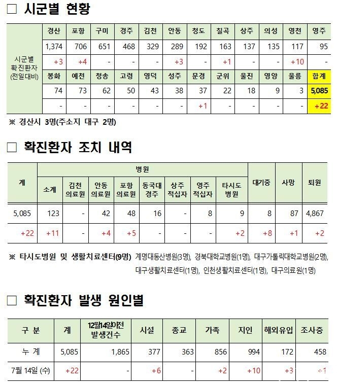 경상북도에서는 7월 14일(수) 0시 기준 코로나19 국내감염 19명, 해외유입 3명이 신규 발생하였다.