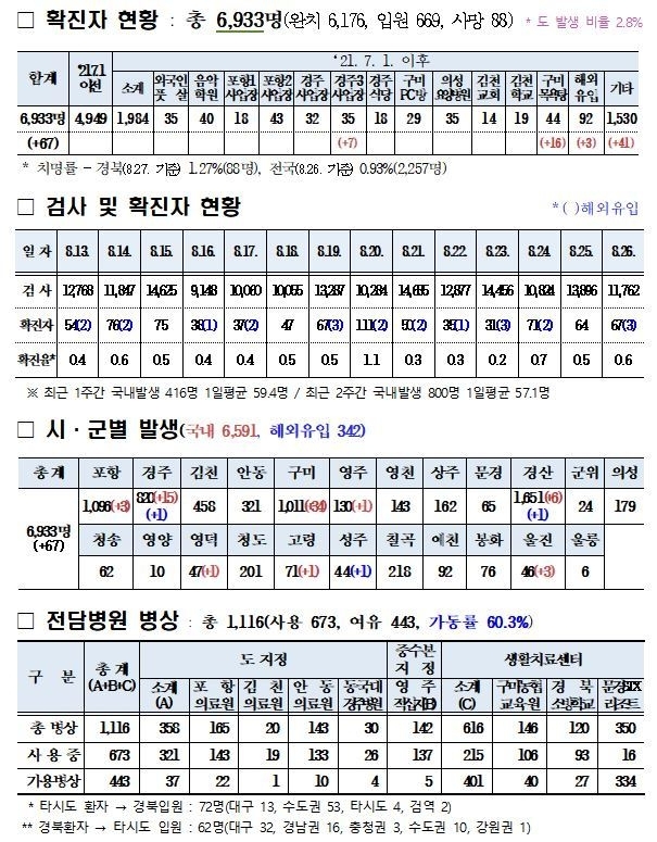 경상북도에서는 8월 27일(금) 0시 기준 코로나19 확진자 국내감염 64명, 해외유입 3명이 신규 발생했다.