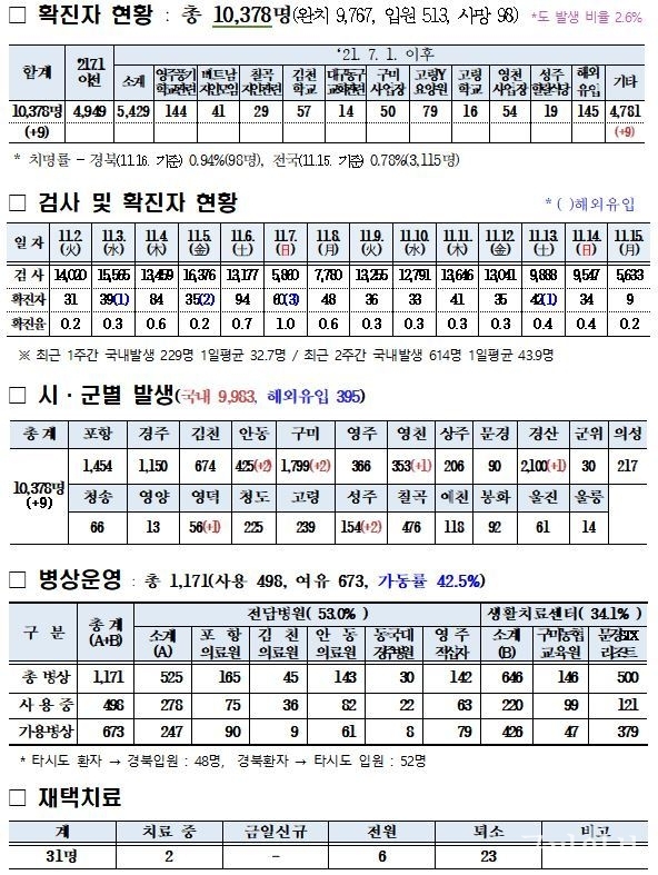 경상북도에서는 11월 16일(화) 0시 기준 코로나19 확진자 국내감염 9명이 신규 발생했다.