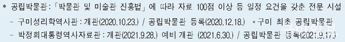 작년 10월에 개관한 구미성리학역사관에 이어 올해 9월 개관한 박정희대통령역사자료관도 공립박물관(제1종 전문박물관)으로 정식 등록되며 볼거리와 놀거리를 갖춘 구미 대표 명소로 자리매김하고 있다.