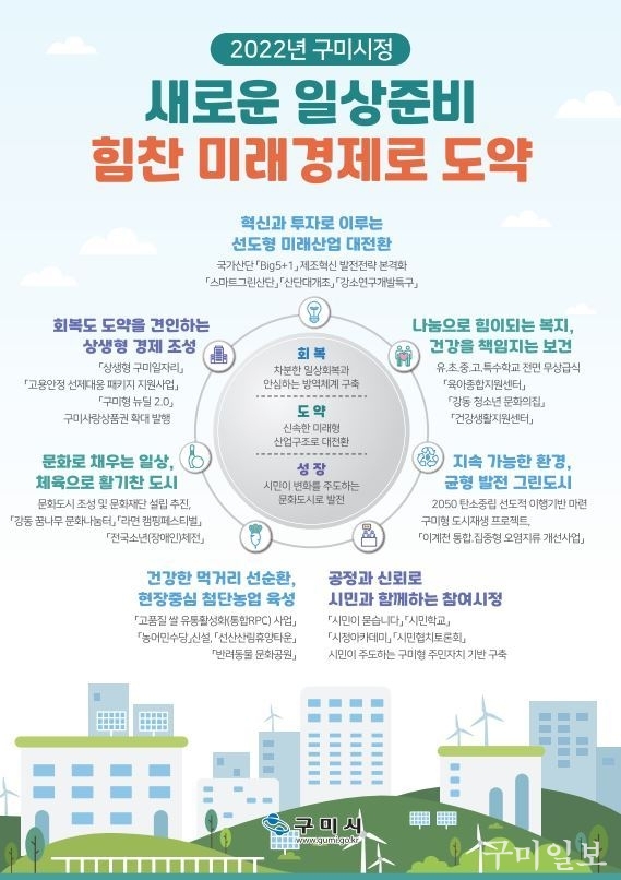 구미시(시장 장세용)는 2022년 임인년(壬寅年) 새해 시정목표를 ‘새로운 일상 준비, 힘찬 미래경제로 도약’이라 정하고, 선도형 미래산업으로 대전환과 상생형 경제 기반을 통한 빠른 일상 회복을 위해 모든 역량을 집중하겠다고 밝혔다.