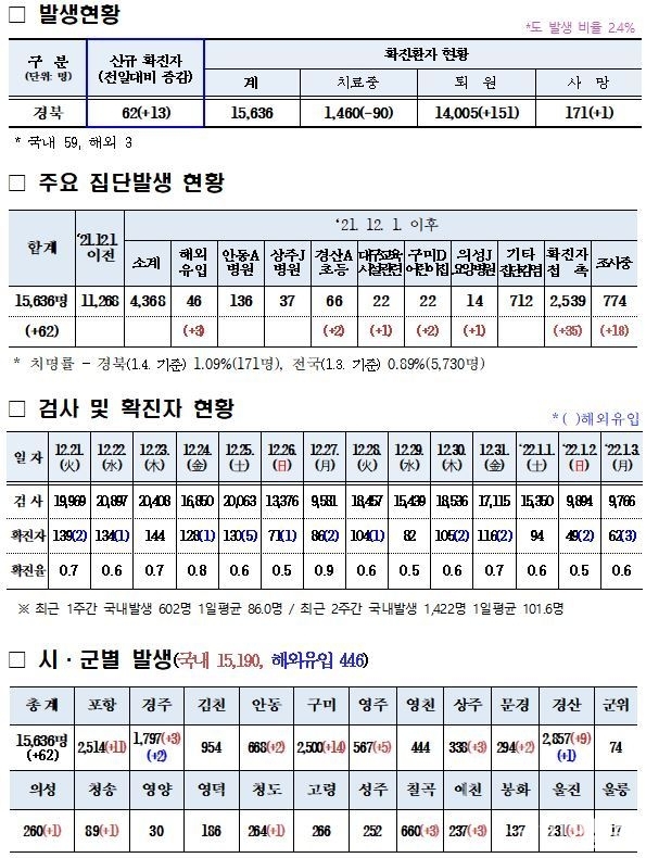 경상북도에서는 1월 4일(화) 0시 기준 14개 시·군(시 8, 군 6)에서 코로나19 확진자 국내감염 59명, 해외감염 3명이 신규 발생했다.