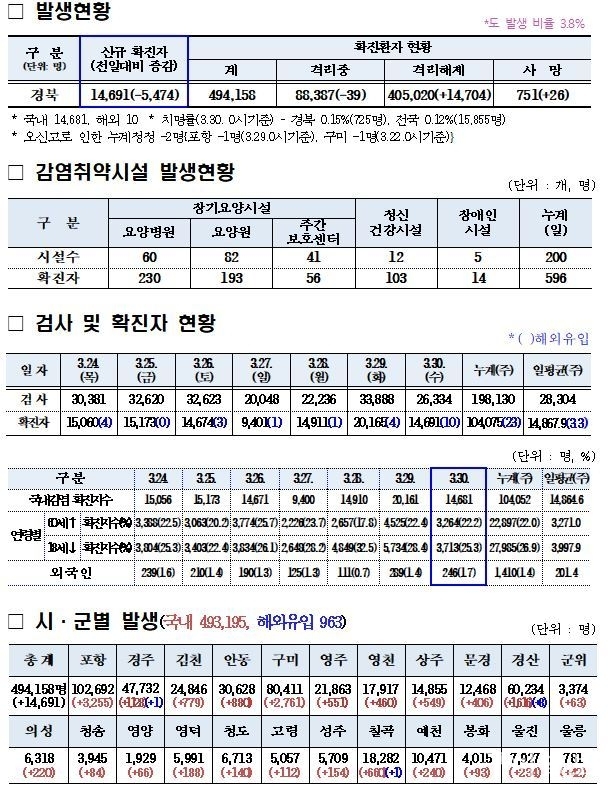 경상북도에서는 3월 31일(목) 0시 기준 23개 시·군(시 10, 군 13)에서 코로나19 확진자 국내감염 1만4681명, 국외감염 10명이 신규 발생했다.