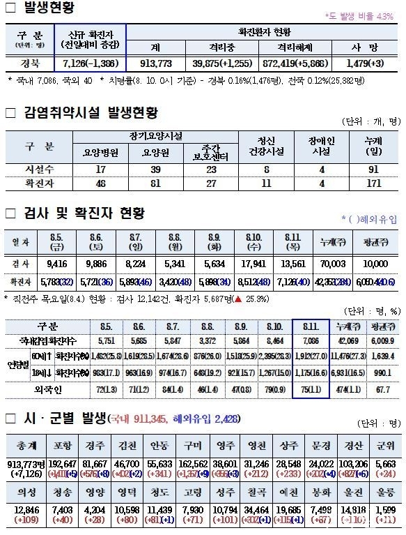 경상북도에서는 8월 11일(목) 0시 기준 23개 시·군(시 10, 군 13)에서 코로나19 확진자 국내감염 7,086명, 국외감염 40명이 신규 발생하였다.