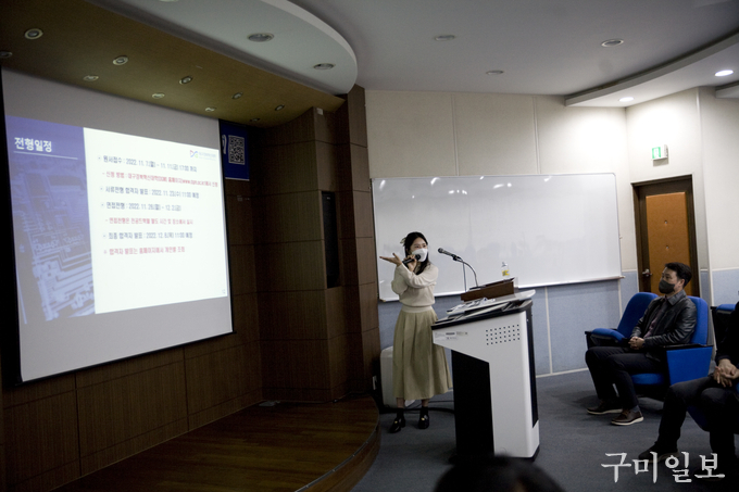 이번 학생모집 설명회는 2023학년도부터 개설되는 대구경북혁신대학에 입교를 희망하는 김천대학교 ICT군사학부, 스마트모빌리티학과 등에 소속된 재학생을 위해 마련되었으며, 학생모집과 관련한 자세한 안내와 학생들의 궁금증을 해소하고자 경북대학교 RIS대학교육혁신본부 문병인 부본부장, 이동양 팀장, 곽윤빈 부팀장, 이서현 연구원 등 교직원들이 김천대학교를 직접 방문하여 설명회를 진행하였다.