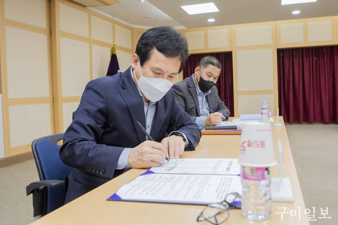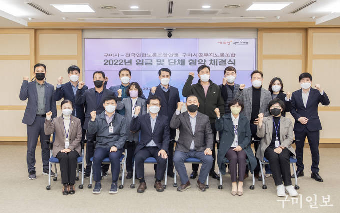 구미시(시장 김장호)는 전국연합노동조합연맹 구미시 공무직노동조합(위원장 김정국)과 지난 11월 10일(목) 오후 4시, 시청 3층 상황실에서 노사 양측 교섭위원 16명이 참석한 가운데, 2022년 임금·단체협상을 마무리하는 협약 체결식을 가졌다.