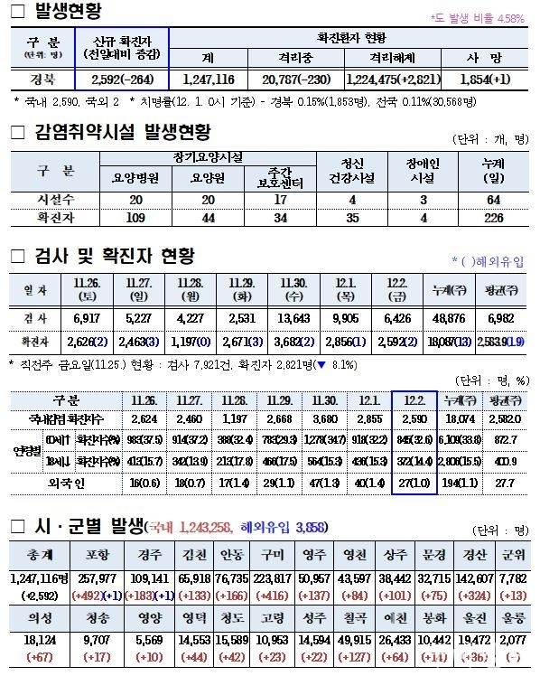 경상북도에서는 12월 2일(금) 0시 기준 22개 시·군(시 10, 군 12)에서 코로나19 확진자 국내감염 2,590명, 국외감염 2명이 신규 발생하였다.