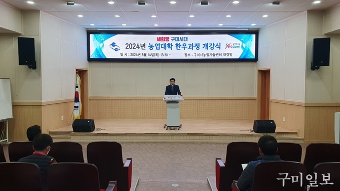 구미시농업기술센터(소장 김영혁)는 3월 14일(목) 교육생 60여 명이 참석한 가운데 『2024년 구미시 농업대학 한우 과정 개강식』을 열었다.