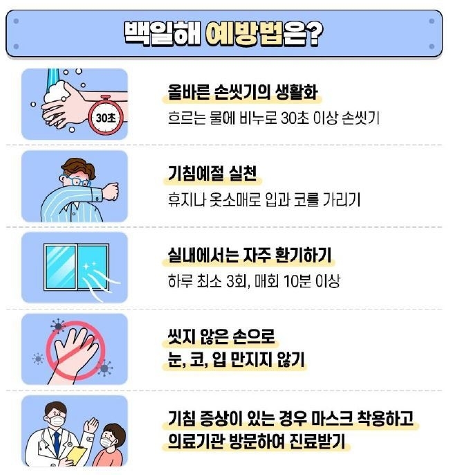만 6세까지 총 5회의 접종을 실시하고, 연령이 증가할수록 백신의 효과가 감소하는 만 11~12세에도 6차 접종을 해야 면역력이 형성된다. 또한, 올바른 손 씻기를 생활화하고, 기침 예절을 준수해야 하며, 호흡기 증상 발생 시 등교‧등원을 자제하고 즉시 의료기관의 진료를 받아야 한다.