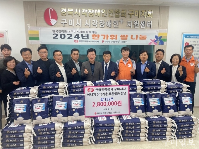한국전력공사 구미지사(지사장 김형길)는 9월 13일(금) 추석을 맞이하여 구미시 시각장애인플러스지원센터에 에너지 취약계층을 위한 쌀 132포를 전달하였다.
