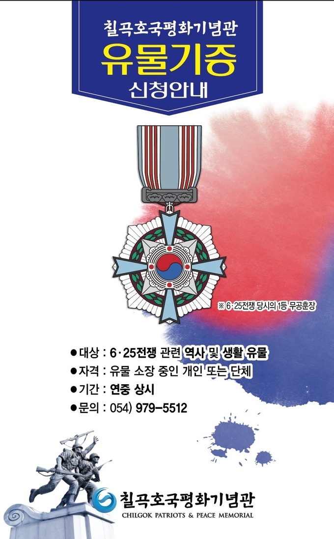 칠곡호국평화기념관(이하 기념관)은 학술연구 및 전시 자료로 활용하기 위한 6·25전쟁 관련 유물을 기증받는다.