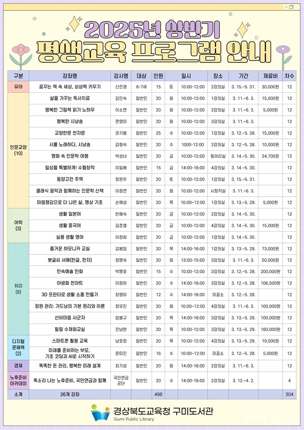 경상북도교육청 구미도서관(관장 최선지)은 2월 20일(목)부터 3월 4일(화)까지 도서관 누리집를 통해 2025년 상반기 평생학습프로그램 수강생을 모집한다고 밝혔다.