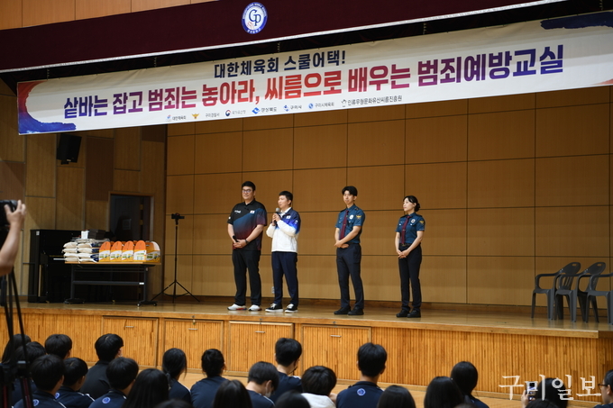 구미경찰서(서장 김동욱)와 대한체육회(회장 유승민), 인류무형문화유산씨름진흥원, 구미시청 씨름단, 광평중학교가 공동주최한 청소년 도박 등 중독범죄 예방 프로젝트, ‘SPO 스쿨어택!!「샅바는 잡고, 범죄는 놓아라」- 씨름으로 배우는 범죄예방교실’이 지난 6월 18일 광평중학교(교장 김수철)에서 전교생 208명의 뜨거운 호응 속에 성황리에 개최되었다.