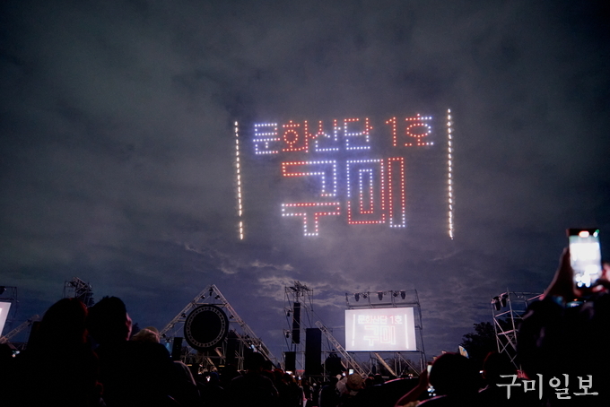 축하공연 후 이어진 드론쇼 <산단의 밤을 밝히다, 구미 드론쇼>에서는 500대의 드론이 구미의 산업 역사와 미래 비전을 밤하늘에 그려내며 환상적인 밤하늘을 연출했다.